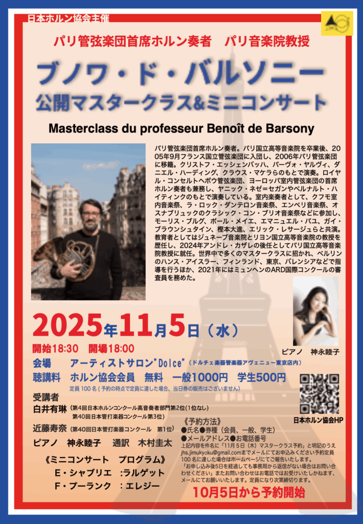 【パリ管弦楽団首席ホルン奏者 パリ音楽院教授 ブノワ・ド・バルソニー公開マスタークラス&ミニコンサート】開催のお知らせ
